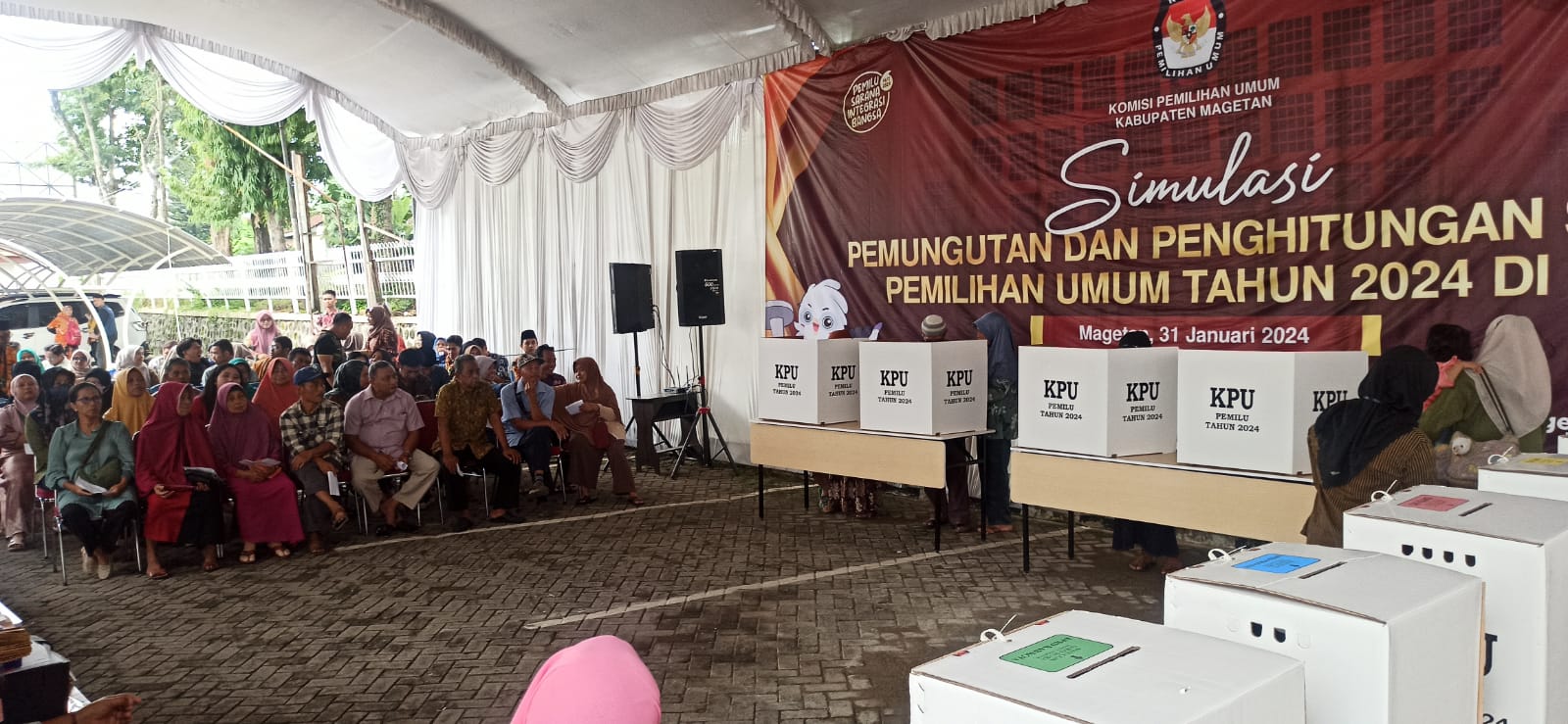 Magetan | jatim.siberindo.co – Dalam rangka mensukseskan Pemilu 2024, Komisi Pemilihan Umum (KPU) Kabupaten Magetan menggelar simulasi pemungutan dan penghitungan suara. Bertempat di halaman KPU, pada Rabu (31/1/2024).