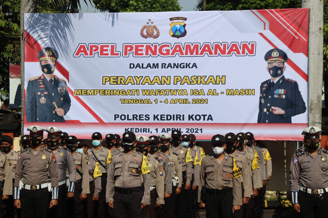 KEDIRI- Dalam rangka menjaga situasi kemanan dan ketertiban masyarakat, Polres Kediri Kota menggelar apel gabungan persiapan pengamanan memperingati wafatnya Isa Almasih, Kamis (01/02/2021)