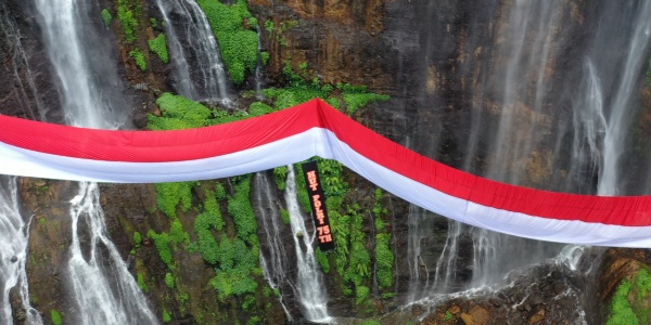 Bendera raksasa tersebut berukuran panjang 100 meter x 6 meter di kibarkan di tebing air terjun Coban Sewu dan Tumpak Sewu.