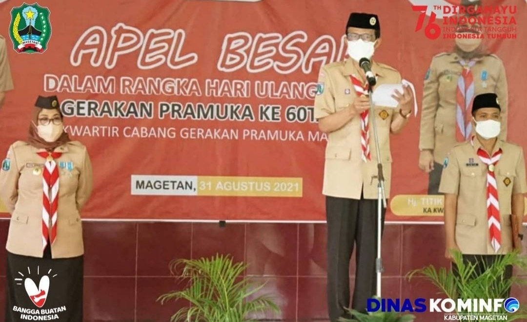 Bupati Magetan Suprawoto, sekaligus Ketua Majelis Pembimbing Cabang Gerakan Pramuka Kab Magetan berpesan, agar para Pramuka melaksanakan 2 (dua) gerakan. Yakni, gerakan kedisiplinan nasional dengan mewujudkan perilaku mematuhi protokol kesehatan. ” Kedua yaitu gerakan kepedulian nasional dengan mewujudkan sikap empati dan simpati menolong sesama hidup,” ujar Bupati dalam sambutannya, Selasa (31/8).