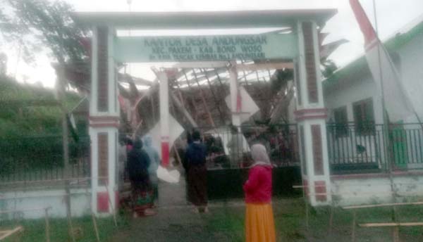 BONDOWOSO – Baru empat tahun berdiri atap pendopo Balai Desa Andung Sari, Kecamatan Pakem, Kabupaten Bondowoso ambruk. Atap pendopo Balai Desa Andung Sari ambruk setelah sejak semalam diguyur hujan lebat.