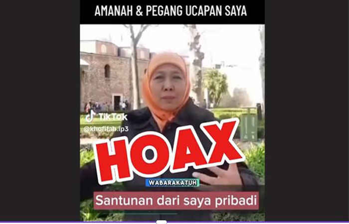 SURABAYA | Jatim.siberindo.co – Calon Gubernur Jawa Timur, Khofifah Indar Parawansa, menyayangkan penyebaran video hoax yang mencatut namanya dan viral di media sosial, khususnya di platform TikTok. Video berdurasi 29 detik itu memperlihatkan Khofifah seolah-olah mengumumkan kemenangan di Pilgub Jatim 2024 sekaligus menjanjikan santunan sebagai bentuk rasa syukur.