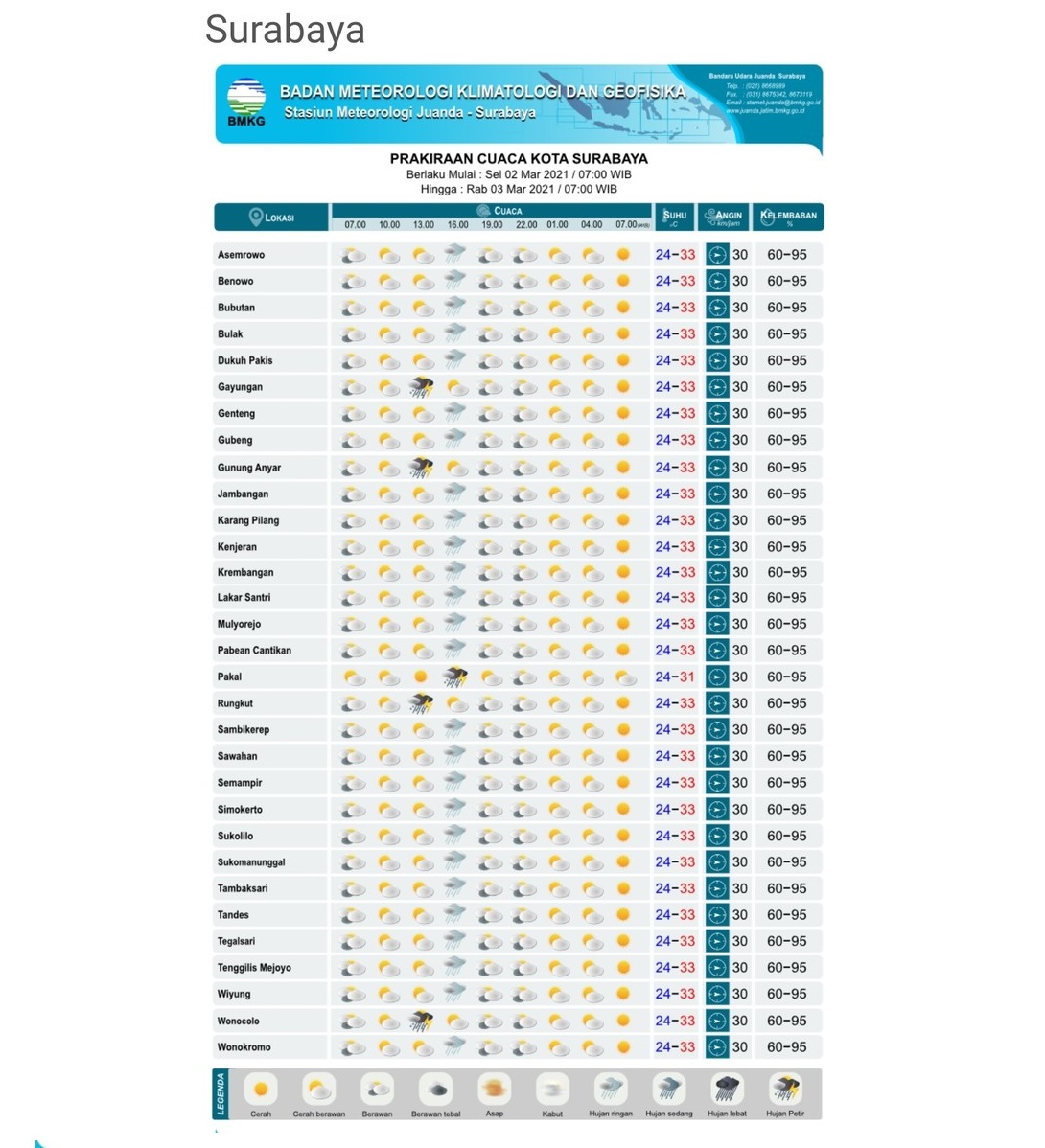 “Suhu udaranya 24-33⁰ C, kelembaban udara 60-95%, angin dari barat dengan kecepatan 30 km/jam,” keterangan pada data BMKG Juanda Surabaya, Selasa (2/3/2021). (*/cr4)