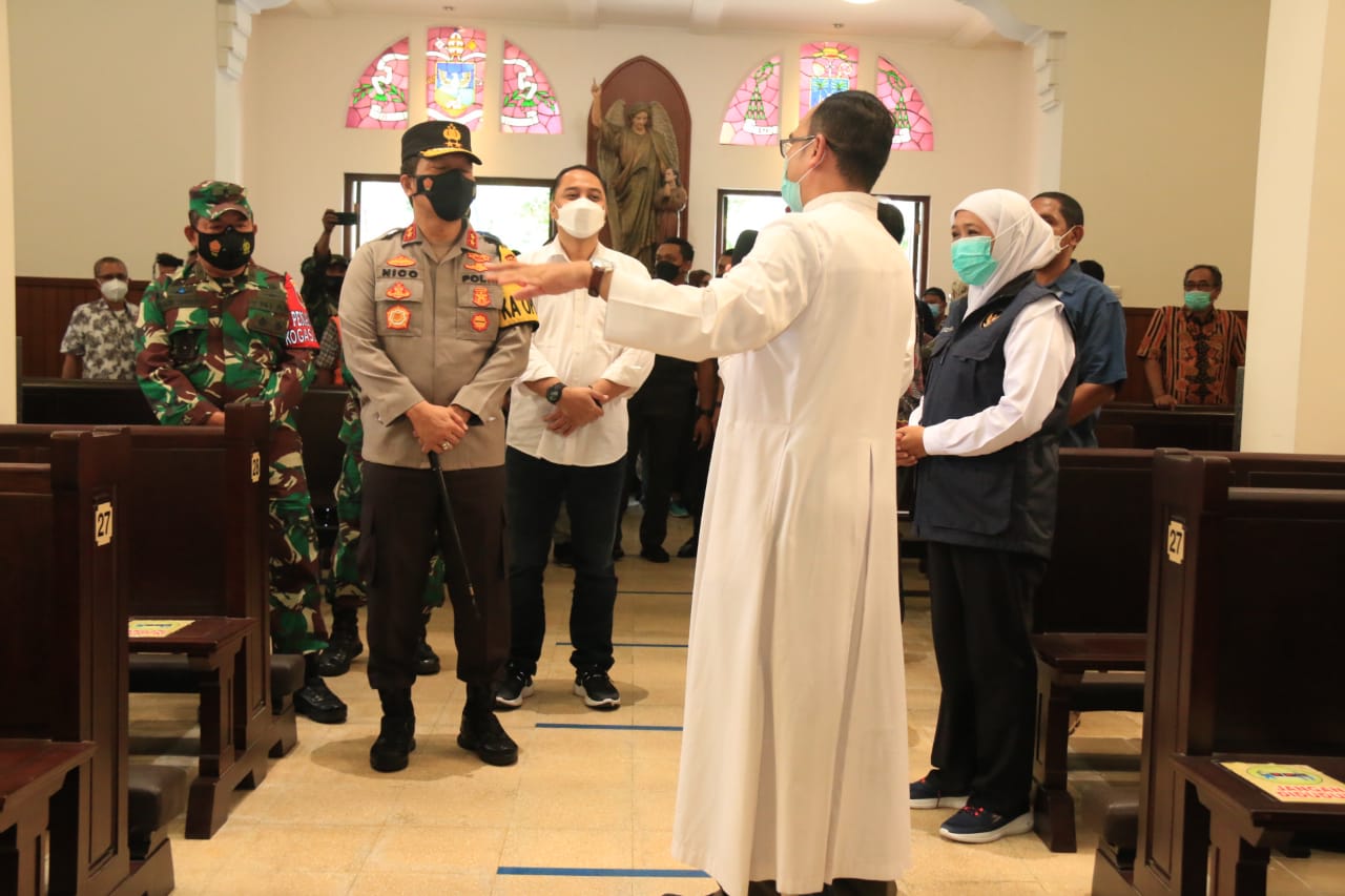 Forkopimda Jatim juga melihat kesiapan di dalam gereja, seperti tempat duduk Jemaat, Alat Prokes, dan memberi bantuan berupa alat prokes Covid-19.