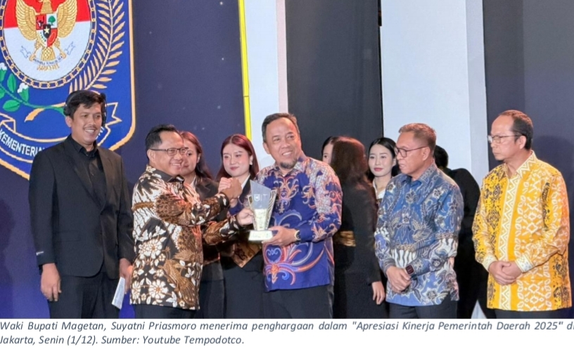 ​Penghargaan ini diserahkan langsung oleh Menteri Dalam Negeri RI kepada Wakil Bupati Magetan, SuyaTNI Priasmoro, S.H., M.H., dalam acara “Apresiasi Kinerja Pemerintah Daerah 2025” di Jakarta pada 1 Desember 2025 kemarin.