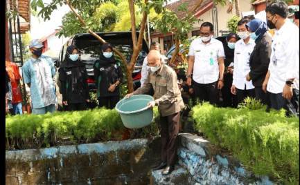 Dr. Ir.Wahid Wahyudi , MT. didampingi Astrid Wahid Wahyudi juga melakukan tabur benih ikan nila sebagai wujud dukungan terhadap jurusan perikanan yg di prioritaskan dalam usulan SMK PK tahun 2021.
