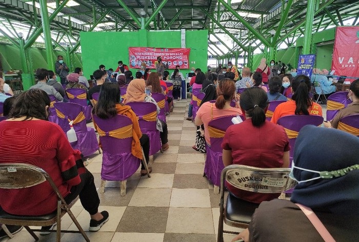 Sidoarjo – 1.200 Pedagang tradisional Pasar Baru Porong Sidoarjo, menjalani vaksinasi COVID-19. Para pedagang ikut divaksinasi karena mereka dinilai rentan terpapar COVID-19.