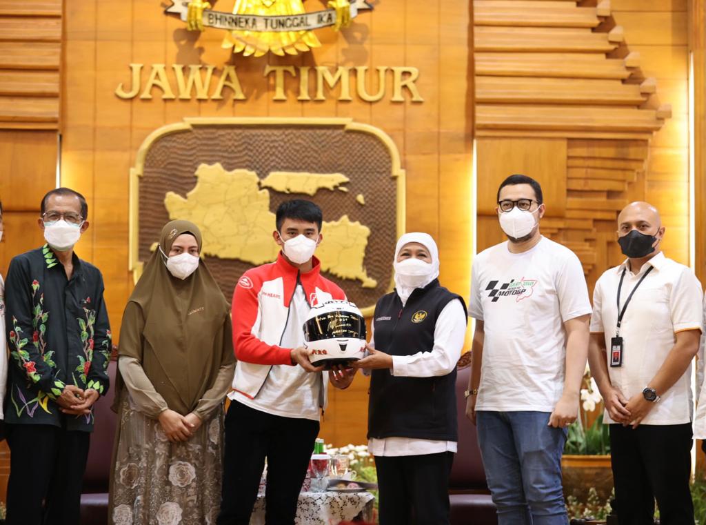 MAGETAN | JATIM.SIBERINDO.CO – Pulang ke Indonesia, pembalap muda asal Kabupaten Magetan Jawa Timur, Mario Suryo Aji, berkunjung menemui Gubernur Jawa Timur Khofifah Indar Parawansa, di Gedung Negara Grahadi Surabya, Rabu (01/12/2021).