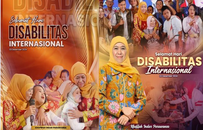 Khofifah Indar Parawansa, menyampaikan pesan khusus untuk memperingati Hari Disabilitas Internasional 2024. “Selamat Hari Disabilitas Internasional 2024. Mari bersama-sama menciptakan perubahan positif sehingga penyandang disabilitas menjadi pilar masyarakat yang aktif menuju tatanan dunia yang inklusif,” ucapnya.