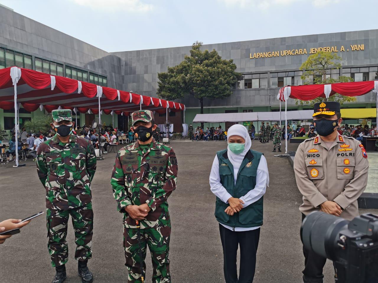 SURABAYA,- Forkopimda Jawa Timur, Gubernur Jatim Khofifah Indar Parawansa, Pangdam V Brawijaya Mayjen TNI Suharyanto, Kapolda Jawa Timur Irjen Pol Nico Afinta serta Kakoarmada II menghadiri kegiatan Serbuan Vaksin yang dilaksanakan oleh Kodam V Brawijaya yang bertempat di Mako Kodam V/ Brawijaya. Yang dilaksanakan pada, Minggu (4/7/2021) pagi.