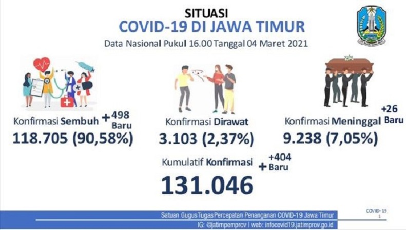 Hingga Kamis (4/3), kasus kumulatif positif Covid-19 di Jatim sebanyak 131.046. Pasien sembuh sebanyak 118.705, dan pasien meninggal berjumlah 9.238.