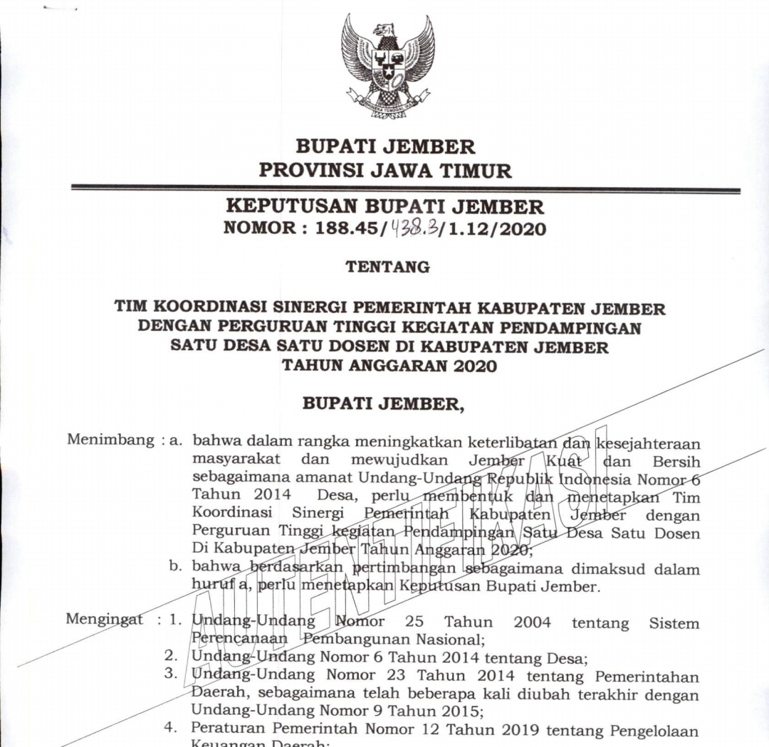 Berdasarkan informasi yang dihimpun, dalam surat yang dikeluarkan Plt Kadispemasdes Edy Budi S menyebutkan, perihal indak lanjut kegiatan Satu Desa atau Kelurahan Satu Dosen Kabupaten Jember tahun 2020 Dasar yakni Kesepakatan Bersama Antara Pemerintah Kabupaten Jember dengan Universitas Jember tertanggal 18 Agustus 2020. Selanjutnya Keputusan Bupati Jember tentang Tim Koordinasi Sinergi Pemerintah Kabupaten Jember dengan Perguruan Tinggi Kegiatan Pendampingan Satu Desa Satu Dosen di Kabupaten Jember Tahun tertanggal 22 September 2020.