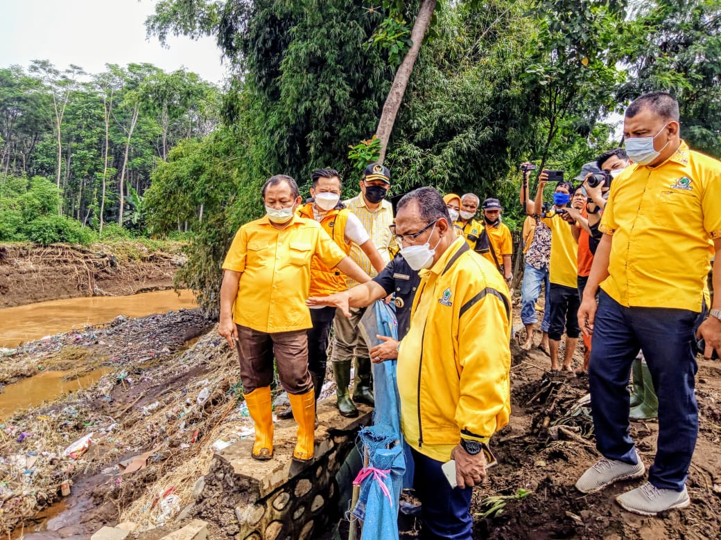 SURABAYA – Ketua DPD Partai Golkar Jatim M. Sarmuji melihat dari dekat kondisi tanggul yang jebol dan menemui warga di desa Dringu, Kecamatan Dringu Kab. Probolinggo, pada Kamis (4/3/2021).