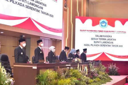 LAMONGAN – Setelah resmi dilantik dan diambil sumpahnya sebagai kepala daerah Kabupaten Lamongan, pada Sabtu (06/03) dilaksanakan serah terima jabatan (sertijab) antara Plh Bupati Aris Mukiyono kepada Bupati Yuhronur Efendi dalam Rapat Paripurna DPRD Kabupaten Lamongan yang dipimpin secara langsung oleh Gubernur Khofifah Indar Parawansa.