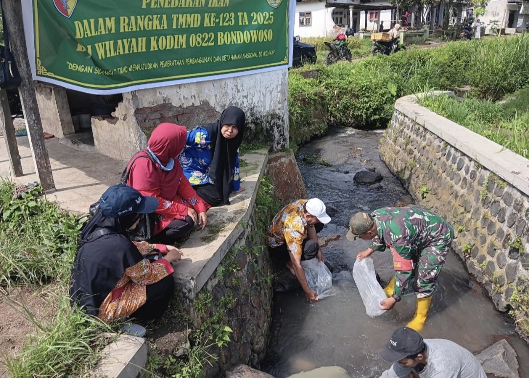 Bondowoso, SIBERINDO.CO – 6 Maret 2025 – Dalam upaya mendukung ketahanan pangan dan meningkatkan ekonomi warga, Satgas TMMD ke-123 Kodim 0822 Bondowoso bersama Dinas Perikanan menggelar kegiatan penebaran 4.400 benih ikan nila di perairan Desa Trotosari, Dusun Krajan. Kegiatan ini turut dihadiri Babinsa Kopka Lukman, Kepala Desa, serta masyarakat setempat yang antusias menyambut program ini.