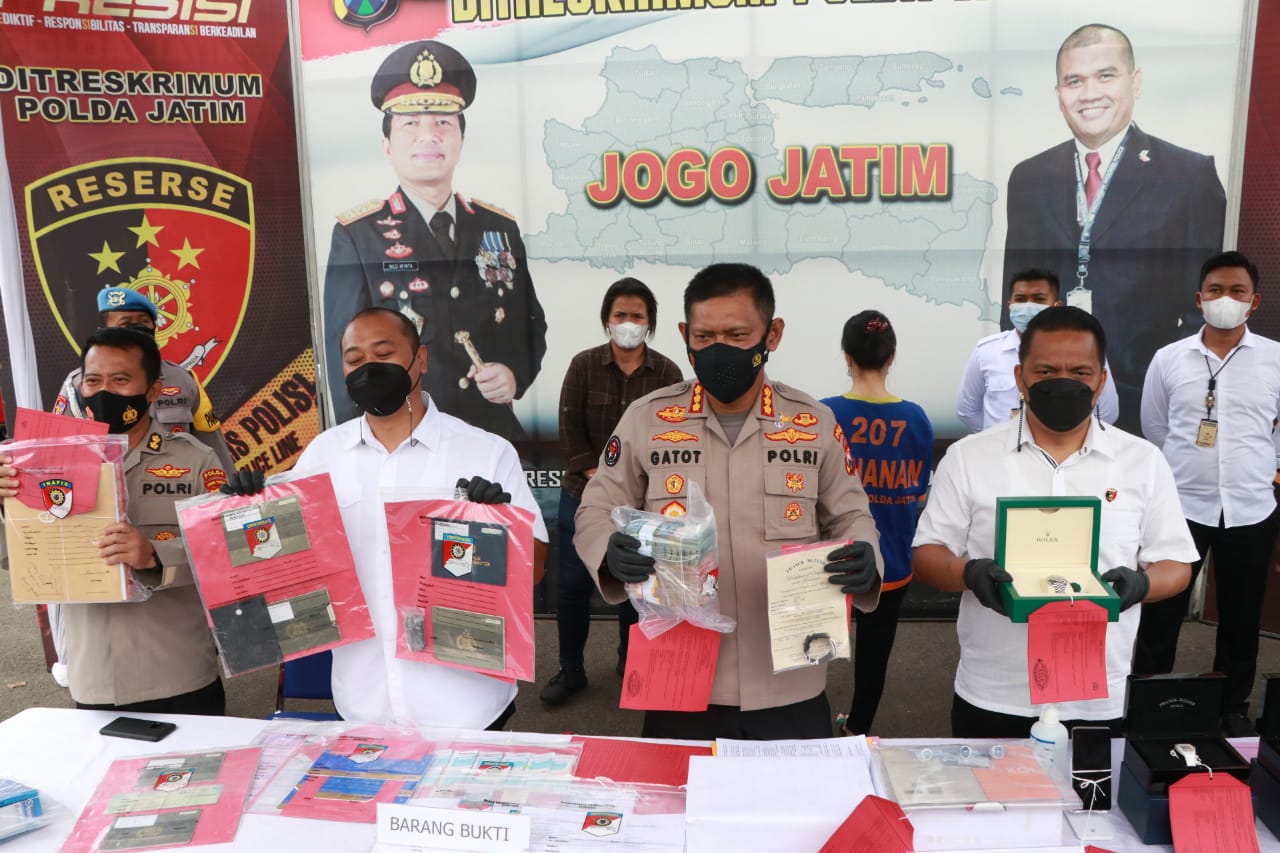 Barang bukti yang berhasil diamankan adalah 7 lembar cek Bank BCA beserta 7 lembar surat keterangan penolakan dari Bank BCA Cabang Pembantu Kusuma Bangsa Surabaya, 2 mobil merek Toyota Fortuner VRZ tahun 2020, 4 unit mobil jenis Mercedes benz, 3unit mobil Pick Up, 6 buah jam tangan berbagai merk mulai dari Rolex, Franck Muller, 3 tiga buah cincin Natural Blue Saphire, dan Uang tunai sebesar Rp. 100 juta.