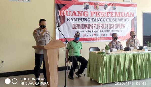 TULUNGAGUNG – Kampung Tangguh Semeru Desa Blimbing, Kecamatan Rejotangan, Kabupaten Tulungagung sudah lengkap dan mendekati sempurna. Hal itu disampaikan Ipda. Zainudin mewakili Kapolres Tulungagung saat mengisi sambutan di ruang pertemuan di Balai Desa Blimbing dalam rangka pelaksanaan Kampung Tangguh Semeru di Dusun Blimbing, Kamis (5/11/2020).