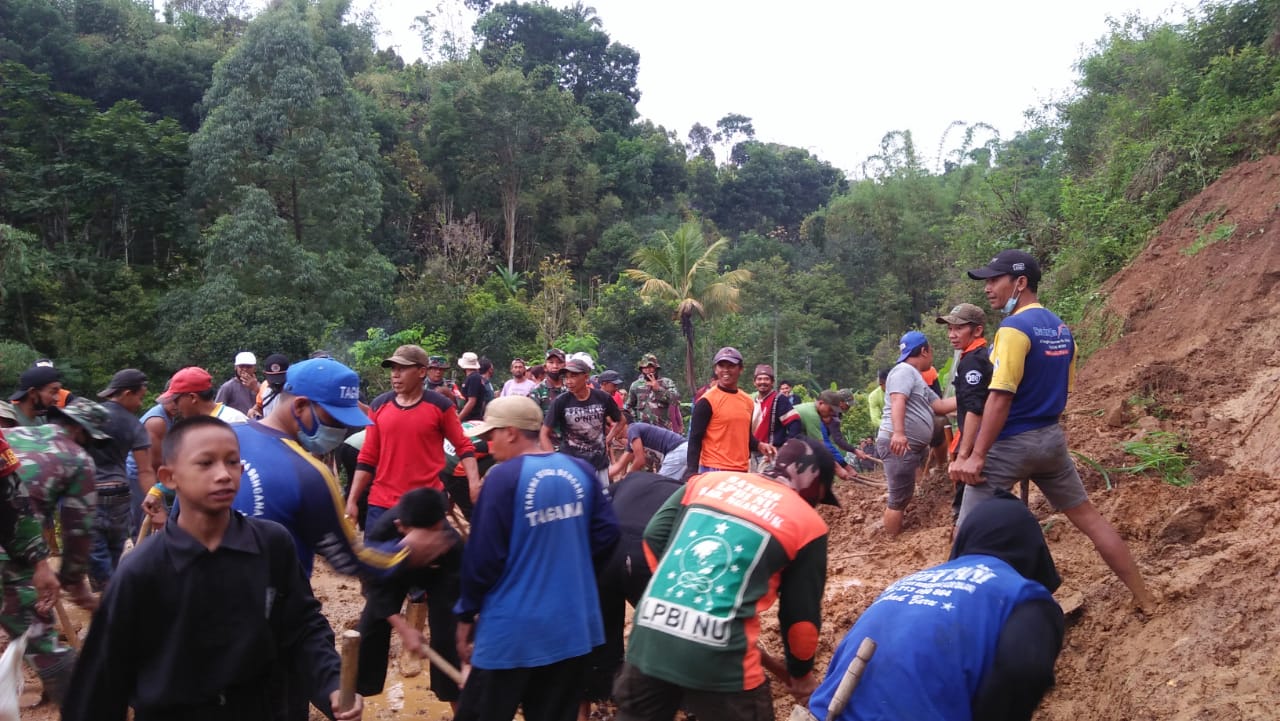 Relawan bencana alam yang terlibat disana, BPBD, PMI, TAGANA, TNI, Polri, LPBI NU, dan masyarakat menggunakan peralatan sederhana, membersihkan gundukan tanah sepanjang sekira 8 meter itu.