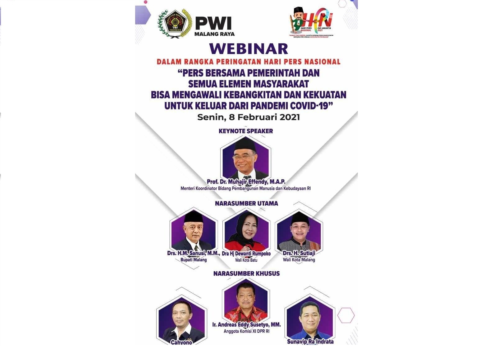 Malang – Dalam rangka memperingati HPN 9 Februari 2021 nanti, Pengurus PWI Malang Raya akan menggelar webinar bersama Menko PMK RI, Prof Dr Muhadjir Effendy, Senin (8/2/1021) pukul 15.00 WIB hingga selesai.