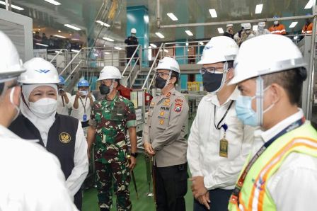 Gubernur Jatim, Khofifah Indar Parawansa, didampingi Pangdam V/Brawijaya, Mayjend TNI Nurchahyanto, dan Kapolda Jatim, Irjen Pol Nico Afinta berkunjung ke pabrik minyak goreng di Gresik.
