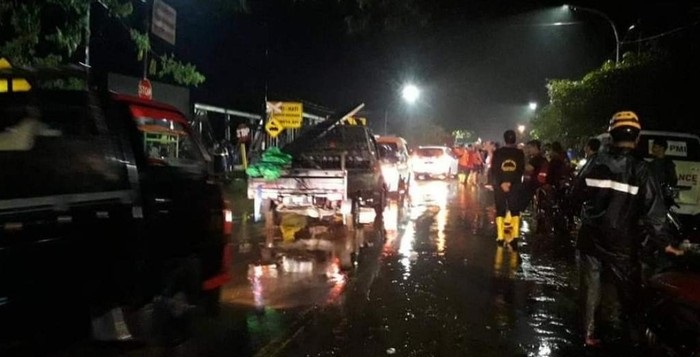 Banjir merendam Jalan Raya Ir Juanda akibat luapan Sungai Petung. Banjir terparah di jalan sekitar Jembatan Buk Wedi.