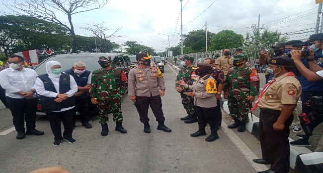 Gubernur Jawa Timur Khofifah Indar Parawansa, Pangdam V Brawijaya Mayjend TNI Suharyanto dan Kapolda Jawa Timur Irjen Pol Nico Afinta didampingi Sekda Prov Jatim, Pejabat Utama Kodam V Brawijaya dan Pejabat Utama Polda Jatim melakukan pengecekan, baik dari kesiapan petugas, maupun mekanisme yang dilakukan dalam melakukan penyekatan.