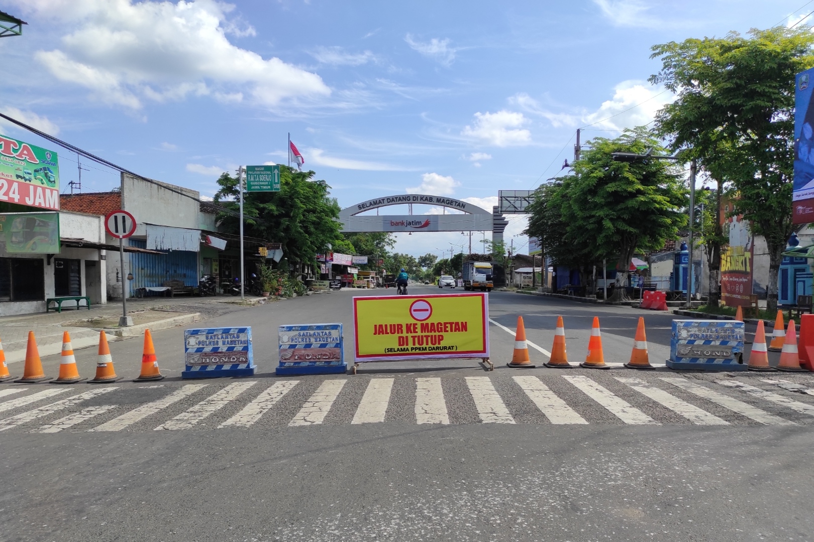 PPKM Darurat dalam rangka membatasi mobilisasi di wilayah Kabupaten Magetan, petugas gabungan melakukan penutupan akses jalan di beberapa titik Kabupaten Magetan. Salah satunya di pertigaan Jalan Raya Maospati-Magetan, tepatnya di depan terminal Maospati, Kamis (08/07/2021).
