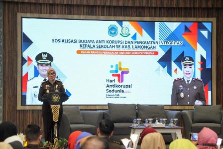 LAMONGAN | Siberindo – Semarakkan Hari Anti Korupsi Sedunia (Hakordia) 2022 yang jatuh pada 9 Desember esok, Lamongan menyelenggarakan sosialisasi budaya anti korupsi dan penguatan integritas kepala sekolah se-Kabupaten Lamongan, Kamis (8/12) di Aula Gadjah Mada Pemkab Lt.7.