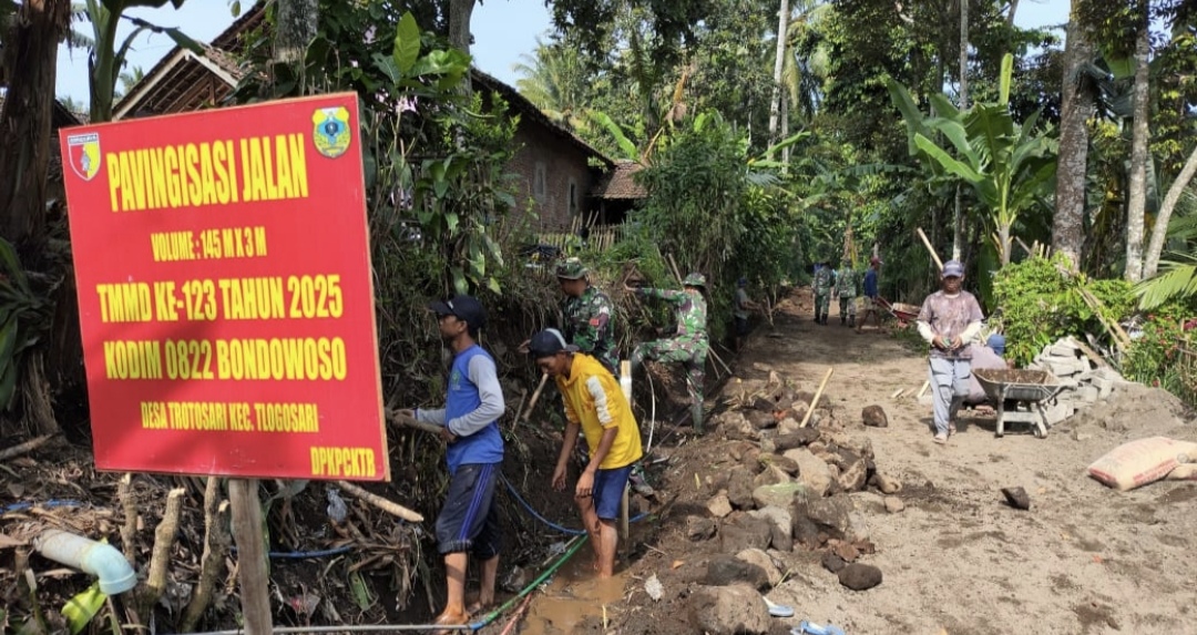 Bondowoso, SIBERINDO.CO – Di pagi yang cerah ini Anggota Satgas TNI Manunggal Membangun Desa (TMMD) Reguler Ke-123, Kodim 0822 Bondowoso, personel yang tergabung dalam Satgas TMMD bertempat di Dusun Krajan Rt. 02 Rw. 01 Desa Trotosari, Kecamatan Sukosari, Kabupaten Bondowoso yang kebut pembuatan plengsengan jalan, Minggu (9/3/2025).
