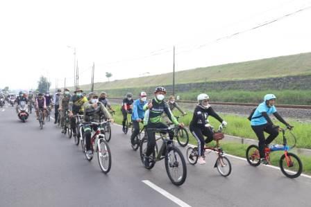 SIDOARJO – Gowes ke Jabon dilakukan Bupati Sidoarjo H. Ahmad Muhdlor Ali S.IP bersama seluruh kepala OPD Sidoarjo yang ada, Jumat pagi, (9/4). Start dilakukan dari pendopo Delta Wibawa Sidoarjo. Ketua DPRD Sidoarjo H. Usman M.Kes serta Pimpinan Kantor Wilayah BRI Surabaya Tris Wahyu Herlina bersama jajaran Kanwil BRI Surabaya juga ikut dalam gowes kali ini. Gowes dilakukan bukan tanpa sebab. Dari pendopo ke Jabon untuk melakukan penanaman 1.000 bibit pohon trembesi. Bibit pohon trembesi tersebut sumbangsih dari seluruh jajaran pegawai BRI yang berada di Kanwil BRI Surabaya. Penanaman pohon tersebut bagian dari program penghijauan pro planet BRI.