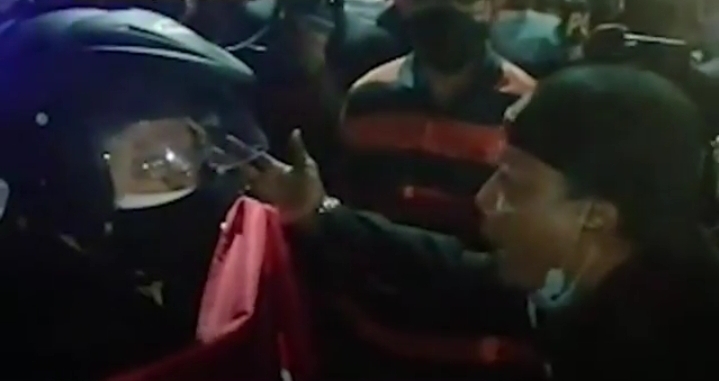 “Ya, ibu aku sudah bilang sama bapak-bapak polisi, pak mohon maaf, jangan pukul saudara-saudara kita, ya ibu yang tanggung jawab ya.” sahut salah satu pendemo.