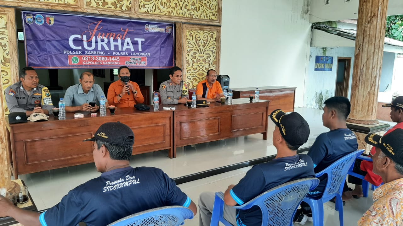 Kapolsek Sambeng IPTU Suroto SH, MH menjelaskan, intinya kegiatan Jum’at Curhat ini dilaksanakan secara rutin dari tingkat Mabes Sampai Polsek, yakni ngobrol bersama menyampaikan unek-unek permasalahan yang ada di masyarakat.