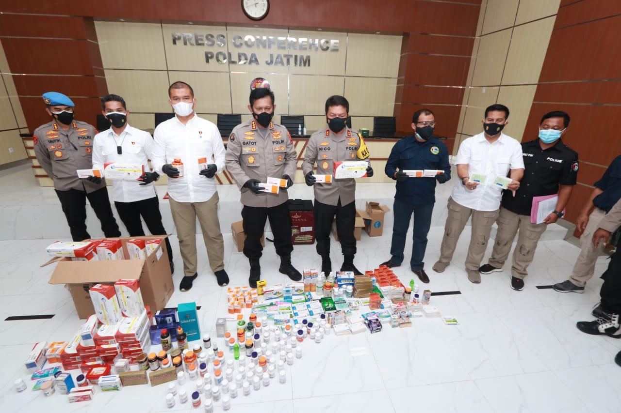 “Hari ini kami mengungkap adanya tindakan penjualan obat obatan yang dilakukan orang yang tidak benar. Tim melakukan penyitaan 43 jenis obat obatan dan vitamin. Dan tersangka satu orang. Dimana obat dan vitamin ini dijual dan diedarkab bukan oleh orang yang berwenang dalam bidang kefarmasian,” kata Kapolda Jatim, Irjen Nico Afinta, usai Konfrensi pers di Bid Humas Polda Jatim, Sabtu (10/7/2021) siang.