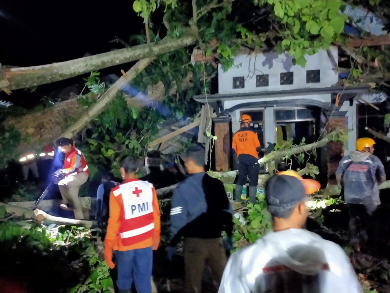 Petugas Tim SAR gabungan BPBD, PMI, Kepolisian dan TNI setempat langsung meluncur ke lokasi kejadian, setelah mendapat laporan warga. Mereka bekerja membersihkan puing berserakan melintang jalan, menggunakan peralatan sederhana.