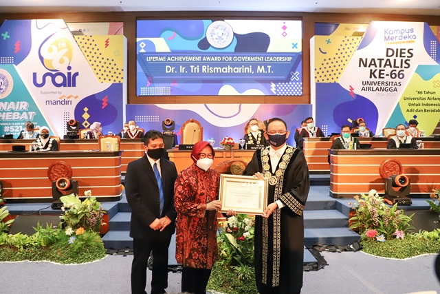 Pada kesempatan itu, Wali Kota Risma menerima penghargaan di momen Sidang Terbuka dalam rangka Dies Natalis Unair ke-66. Acara tersebut berlangsung di lantai lima, Kantor Manajemen, Aula Garuda Mukti, Kampus C Universitas Airlangga, Jalan Mulyorejo, Senin (9/11/2020).