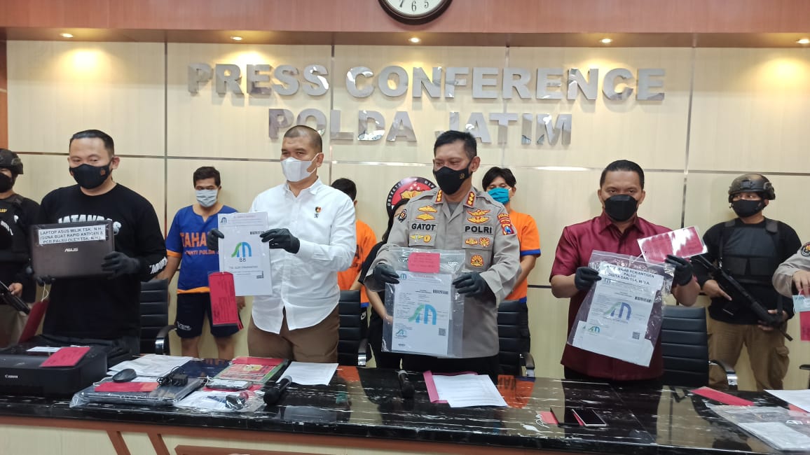 Awalnya anggota menangkap dua tersangka, beserta barang bukti dibawa ke kantor Ditreskrimum Polda Jatim guna proses lebih lanjut. Kemudian hasil keterangan dari keduanya, Timsus Subdit III mengamankan kembali 3 (tiga) orang pelaku lainnya yang 2 (dua) diataranya berperan sebagai marketing dan 1 (satu) orang lainnya berperan sebagai pembuat dan pencetak.