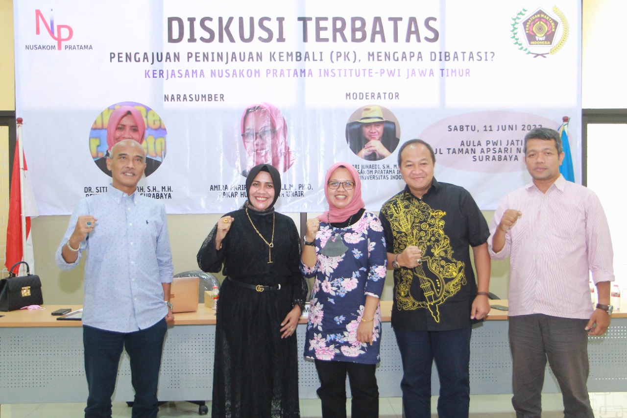 Menyikapi fenomena tersebut, Nusakom Pratama Institue bekerjasama dengan Persatuan Wartawan Indonesia (PWI) Provinsi Jawa Timur (Jatim) menggelar diskusi terbatas dengan tema Peninjauan Kembali (PK), Mengapa Dibatasi?