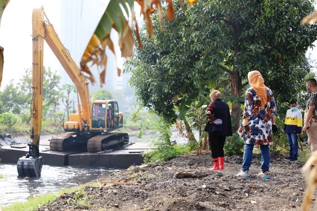 SURABAYA (Suarapubliknews) – Aktifitas pengerukan di sungai Jalan Baruk Utara I, Kedung Baruk, Rungkut dipantau langsung oleh Wali Kota Surabaya Tri Rismaharini, Selasa (11/08/2020). Sungai yang membentang dari Wonorejo Timur hingga Ketintang Baru untuk mengantisipasi meluapnya aliran air ketika curah hujan tinggi.