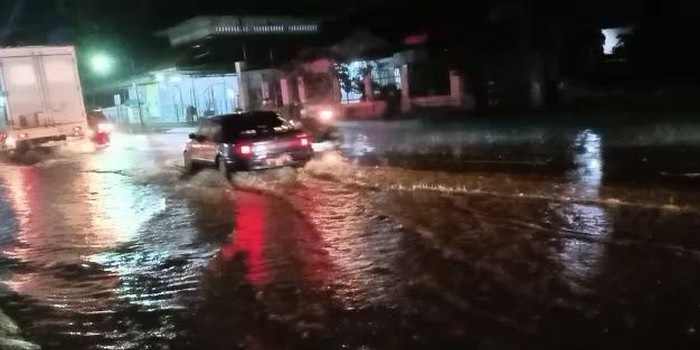 Banjir di Jalan Raya Tambakrejo akibat luapan Sungai Welang. Ketinggian banjir mencapai lutut orang dewasa.