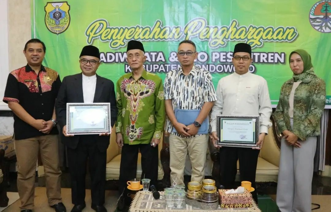 Bupati Bondowoso, Salwa Arifin menyerahkan secara langsung kepada pihak perwakilan sekolah dan Pondok Pesantren penerima penghargaan tersebut, bertempat di Peringgitan pondopo Kabupaten, Jumat (12/5/2023).