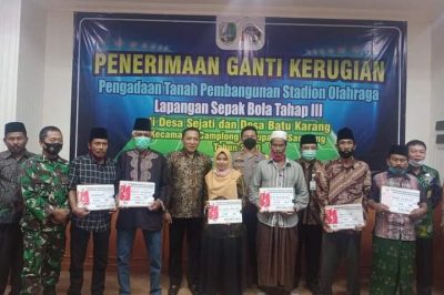 SAMPANG – H Slamet Junaidi selaku Bupati Sampang Madura Jawa Timur menyerahkan dana ganti kerugian Pembangunan Stadion yang ke III