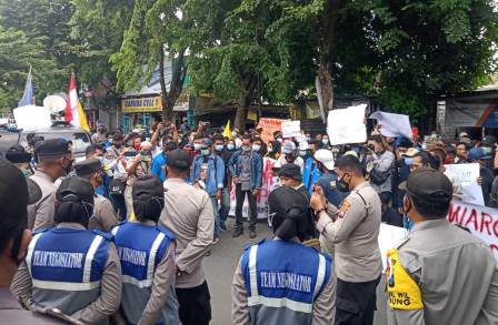 LAMONGAN – Puluhan massa yang tergabung dalam Perhimpunan Mahasiswa Muslim Indonesia (PMII) Cabang Lamongan menggelar aksi demo di Kantor Gedung Pemkab Lamongan, Rabu (13/01/2021)