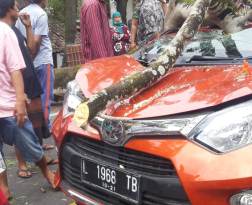 “Iya, Pohon besar tadi tumbang saat saya sedang menjalankan mobil, namun saya baru sadar saat mobil tidak bisa bergerak, ternyata tertimpa pohon besar”, kata Arif pengemudi mobil kepada Media ini