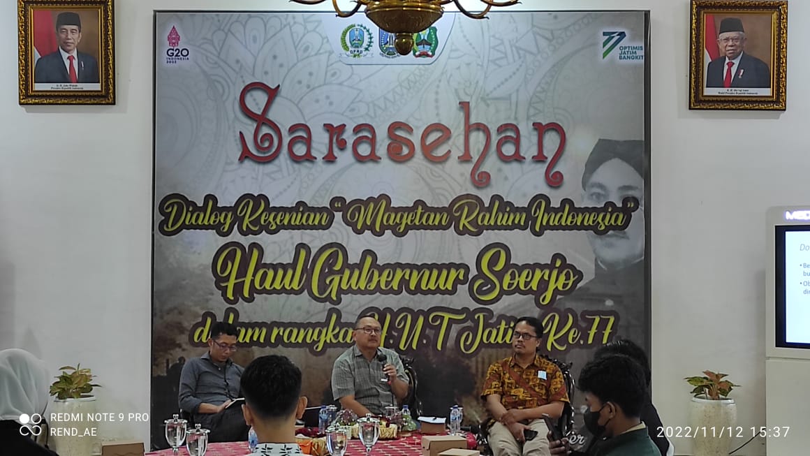 Melalui Dialog Kesenian dengan tajuk Magetan Rahim Indonesia, sarasehan tersebut menghadirka dua narasumber dari bidang sejarah, yakni Dr. Ari Sapto, M.Hum., dan Joko Susanto, serta perwakilan keluarga sekaligus ahli waris dari R.M.T.A Soerjo yan dinobatkan sebagai pahlawan nasional.
