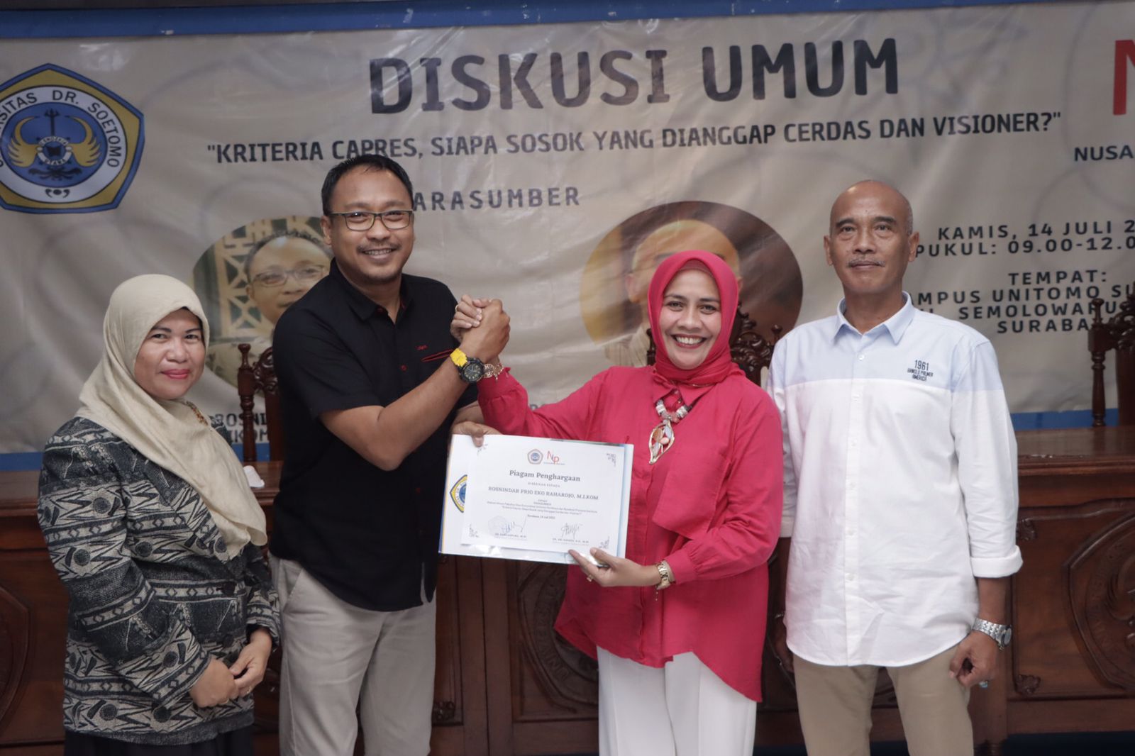 Dalam diskusi yang digelar Fakultas Ilmu Komunikasi Universitas Dr. Soetomo Surabaya bekerja sama dengan Nusakom Pratama Institute menggelar diskusi dengan tema ‘Kriteria Capres, Siapa Sosok yang Dianggap Cerdas dan Visioner?”