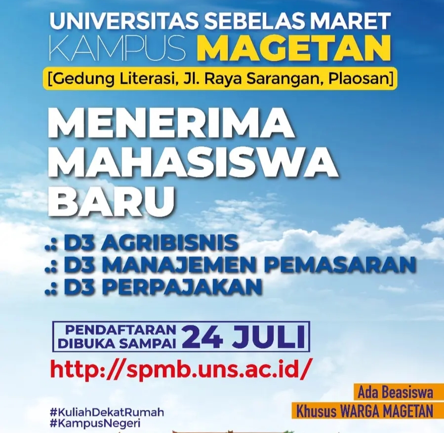 Dengan hastag #KuliahDekatRumah #kampusNegeri, UNS Kampus Magetan membuka Program Vokasi dengan jenjang Diploma sebanyak 3 Jurusan.