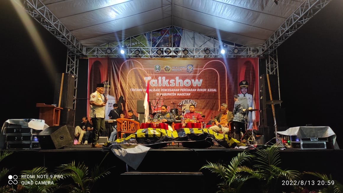 Bertempat di lapangan Desa Kalang Kecamatan Sidorejo Magetan, sosialisasi Gempur Rokok Ilegal diberikan kepada masyarakat melalui dialog interaktif yang dikemas dalam Talk Show, dan melibatkan kearifan lokal, Sabtu malam (13/8/2022).
