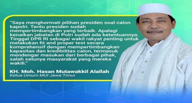 “Mari bersama-sama mendukung apa yang telah menjadi keputusan Presiden. Semoga beliaunya bisa mengemban amanah dengan baik. Negara semakin aman dan Polri makin jaya,” kata Ketua Umum MUI Jawa Timur, KH. Moh. Hasan Mutawakkil Alallah. (Mooch)