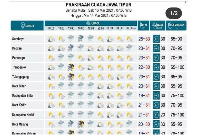 “Waspadai hujan intensitas sedang hingga deras disertai petir dan angin kencang sesaat,” berikut keterangan BMKG Juanda Surabaya di laman resminya, Senin (15/3/2021).