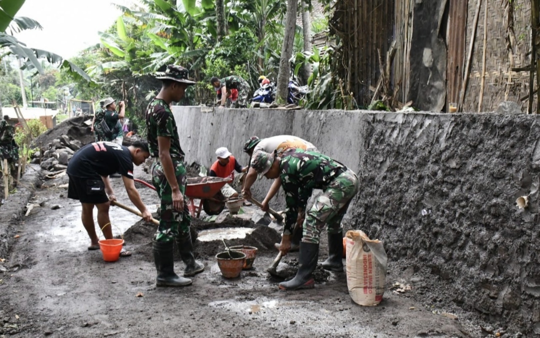 TNI Manunggal Membangun Desa (TMMD) Ke-123 Kodim 0822 Bondowoso personel yang tergabung dalam Satgas TMMD di Desa Trotosari, Kecamatan Tlogosari, Kabupaten Bondowoso akhirnya selesai membangun plengsengan, Sabtu (15/3/2025).
